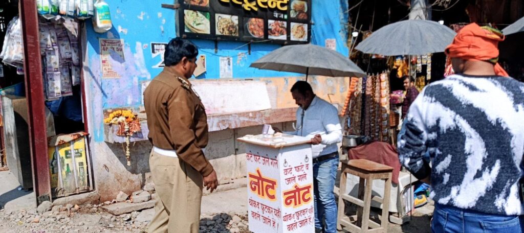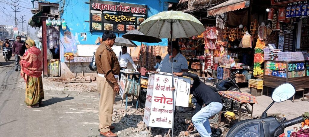 मुगलसराय। (अशोक कुमार जायसवाल) नगर के काली मंदिर क्षेत्र में सोमवार को फुटपाथ पर अतिक्रमण कर लगाए गए कटे-फटे नोटों के कारोबार और अस्थायी दुकानों के खिलाफ पुलिस ने अभियान चलाया। टीआई सत्य प्रकाश यादव के नेतृत्व में पहुंची पुलिस टीम ने फुटपाथ खाली कराते हुए दुकानदारों को सख्त चेतावनी दी कि दोबारा अतिक्रमण करने पर कड़ी कार्रवाई की जाएगी।