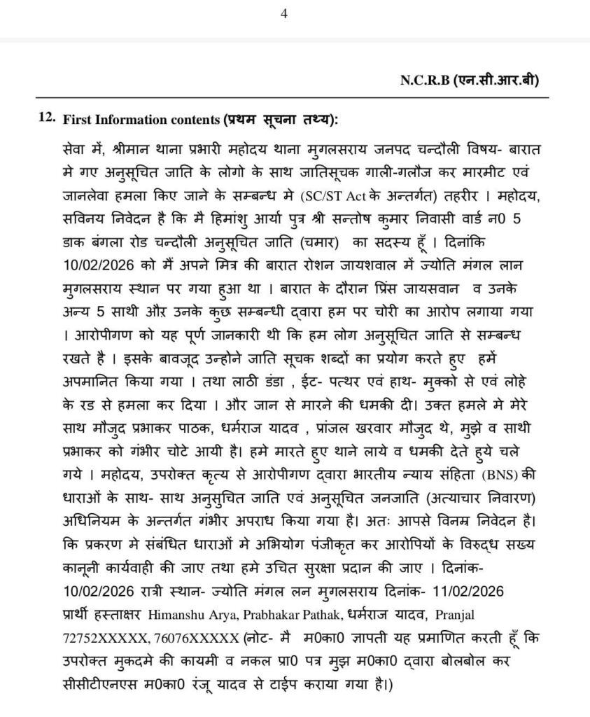 पीड़ित पक्ष वार्ड नंबर 5, डाक बंगला रोड निवासी हिमांशु आर्या ने कोतवाली में दी गई शिकायत में बताया कि वह 10 फरवरी को अपने मित्र की बारात में ज्योति मंगल लॉन, मुगलसराय गए थे। आरोप है कि इसी दौरान प्रिंस जायसवाल और उसके पांच साथियों व कुछ अन्य लोगों ने उन पर चोरी का आरोप लगाते हुए विवाद शुरू कर दिया।