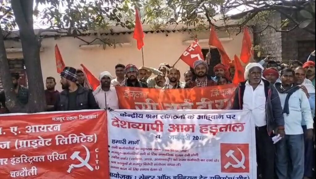 चंदौली मुगलसराय (धर्मेंद्र प्रजापति)- कटरिया में गुरुवार को मजदूरों ने अपनी विभिन्न मांगों को लेकर देशव्यापी हड़ताल के आह्वान पर कामकाज ठप कर जुलूस निकाला और सरकार के खिलाफ जोरदार नारेबाजी की। मजदूरों ने आरोप लगाया कि सरकार श्रमिक विरोधी नीतियां लागू कर उनके अधिकारों का हनन कर रही है।
