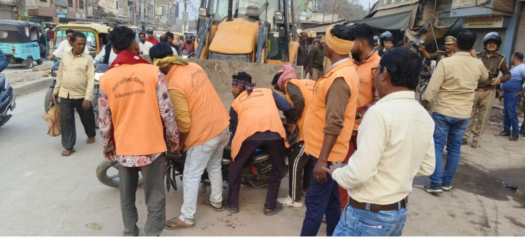 चंदौली।पीडीडीयू नगर ।अशोक कुमार जायसवाल नगर में गुरुवार को नगर पालिका और पुलिस प्रशासन की संयुक्त टीम ने सख्त रुख अपनाते हुए व्यापक अतिक्रमण हटाओ अभियान चलाया। अभियान के दौरान सड़कों और फुटपाथों पर किए गए अवैध कब्जों को हटवाया गया तथा सड़क किनारे खड़े वाहनों पर भी कार्रवाई की गई।