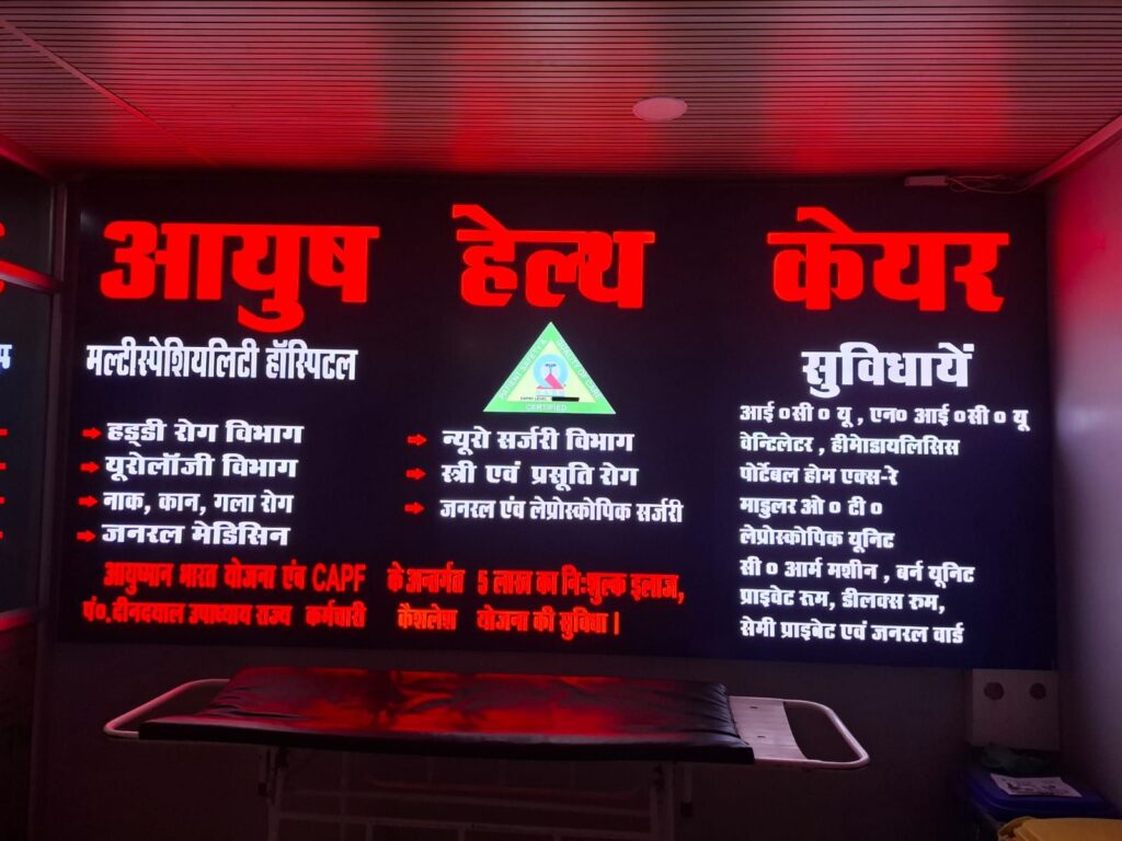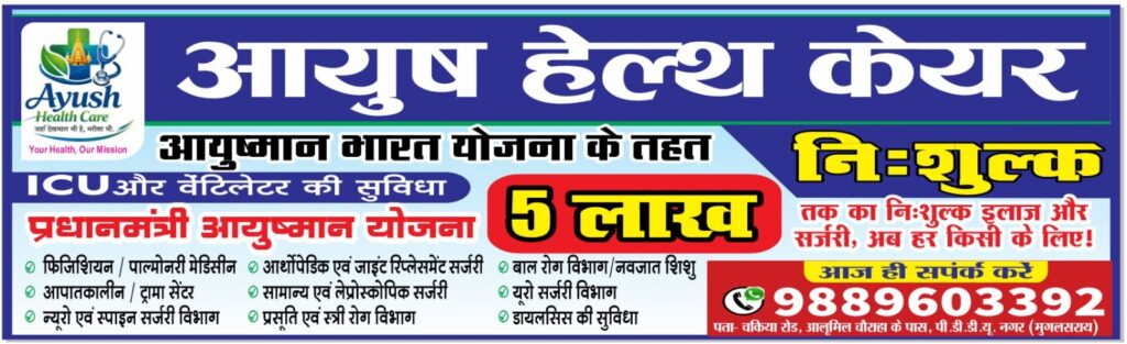 अलीनगर(चन्दौली)- अलीनगर थाना क्षेत्र के वार्ड नंबर-3 आलूमिल के पास (काशी विश्वनाथ कॉलोनी मोड़) स्थित आयुष हेल्थ केयर मल्टीस्पेशियलिटी हॉस्पिटल में क्षेत्रीय लोगों के लिए आधुनिक चिकित्सा सुविधाओ के क्षेत्र में एक नई पहल की है।अस्पताल में विभिन्न विशेषज्ञ डॉक्टरों द्वारा मरीजों का उपचार किया जा रहा है और 24×7 इमरजेंसी सेवा भी उपलब्ध है।