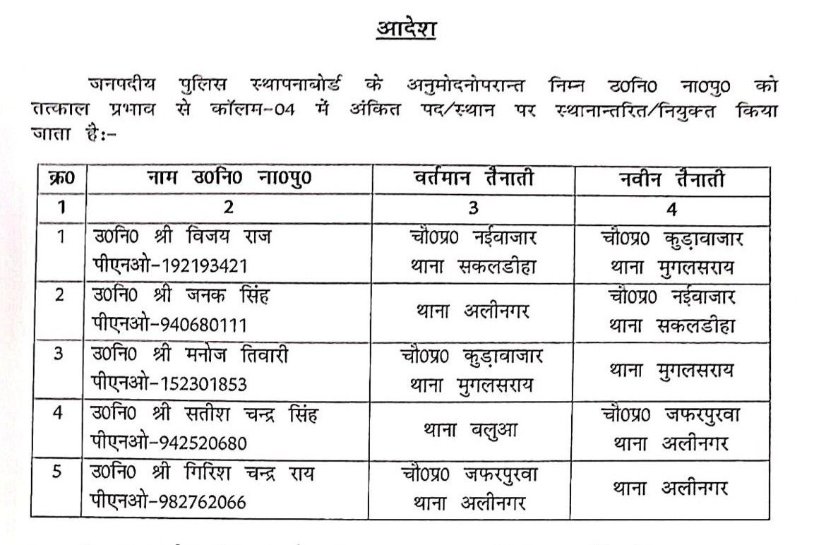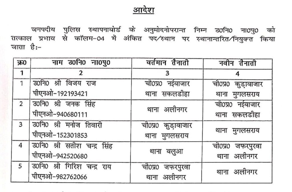चंदौली- जिले में कानून-व्यवस्था को और अधिक सुदृढ़ बनाने के उद्देश्य से पुलिस अधीक्षक आदित्य लांघे द्वारा लगातार प्रशासनिक सख्ती बरती जा रही है। इसी क्रम में शुक्रवार को पांच उपनिरीक्षकों के तबादले किए गए हैं।इस तबादले की सूची में तीन पुलिस चौकियों के प्रभारी भी शामिल हैं। जिनका कार्यक्षेत्र बदला गया है। एसपी द्वारा किए गए इन बदलावों को जिले में पुलिस व्यवस्था को अधिक प्रभावी और सक्रिय बनाने की दिशा में एक अहम कदम माना जा रहा है।