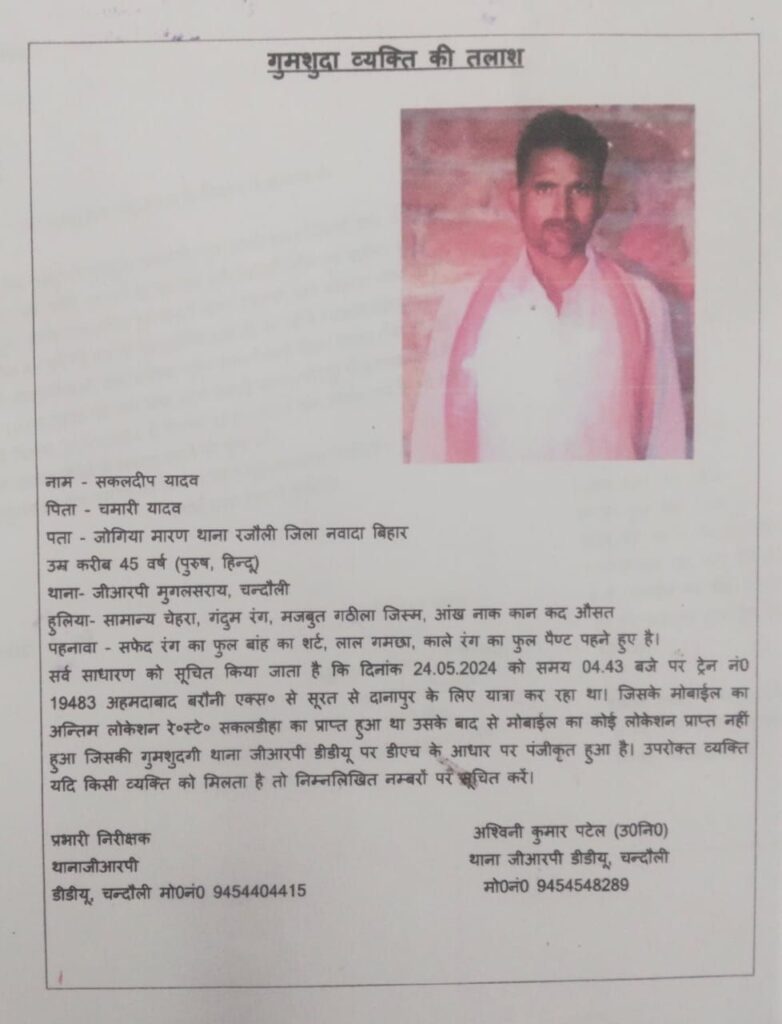 जानकारी के अनुसार सकलदीप यादव 24 मई 2024 कोअहमदाबाद-बरौनी एक्सप्रेस ट्रेन संख्या 19483 से सूरत से दानापुर के लिए यात्रा कर रहे थे। इसी दौरान वह रहस्यमय परिस्थितियों में लापता हो गए। बताया गया कि उनके मोबाइल फोन की अंतिम लोकेशन सकलडीहा क्षेत्र में मिली थी, जिसके बाद से मोबाइल बंद है और उनका कोई पता नहीं चल सका।मामले में जीआरपी डीडीयू थाने में 25 जुलाई 2024 को गुमशुदगी की रिपोर्ट दर्ज की गई है। पुलिस ने आमजन से अपील की है कि यदि किसी को भी सकलदीप यादव पुत्र चमारी यादव के संबंध में कोई जानकारी मिले तो तत्काल जीआरपी डीडीयू चंदौली के प्रभारी निरीक्षक के मोबाइल नंबर 9454404415 या उपनिरीक्षक अश्विनी कुमार पटेल के मोबाइल नंबर 9454548289 पर सूचना दें।