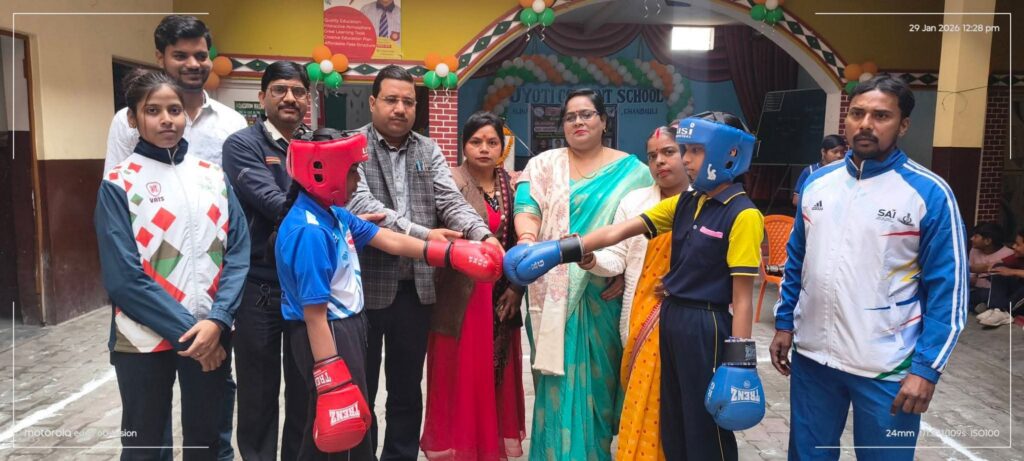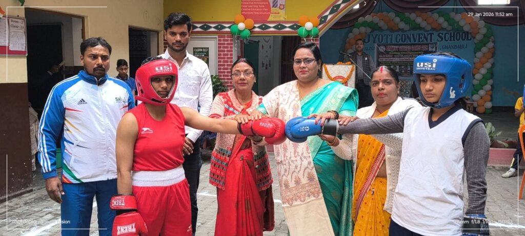 पीडीडीयू नगर- जिला ओलंपिक संघ के तत्वावधान में चंदौली जिला एमेच्योर बॉक्सिंग एसोसिएशन द्वारा अलीनगर सकलडीहा मोड़ स्थित ज्योति कॉन्वेंट स्कूल परिसर में जिला स्तरीय बॉक्सिंग प्रतियोगिता का सफल आयोजन किया गया। प्रतियोगिता में ज्योति कॉन्वेंट स्कूल, प्रयाग इंटरनेशनल स्कूल, सनबीम स्कूल, सेंट्रल पब्लिक स्कूल, नन्द बॉक्सिंग एकेडमी, नगर पालिका टीम, केवी सहित विभिन्न विद्यालयों एवं संस्थानों से कुल 68 खिलाड़ियों ने प्रतिभाग किया। कार्यक्रम का शुभारंभ मुख्य अतिथि आरपीएफ पीडीडीयू जंक्शन के प्रभारी निरीक्षक प्रदीप कुमार रावत एवं विशिष्ट अतिथियों में जिला बॉक्सिंग संघ की अध्यक्ष विनिता अग्रहरी, चंदौली शूटिंगबॉल संघ के जिला अध्यक्ष सतीश जिंदल, ज्योति कॉन्वेंट स्कूल के चेयरमैन कृष्ण मोहन गुप्ता, जिला ओलंपिक संघ की उपाध्यक्ष शालिनी सिंह सहित अन्य गणमान्य अतिथियों द्वारा मां सरस्वती के चित्र पर माल्यार्पण एवं दीप प्रज्ज्वलन कर किया गया। इसके पश्चात अतिथियों ने खिलाड़ियों से परिचय प्राप्त कर हाथ मिलवाकर