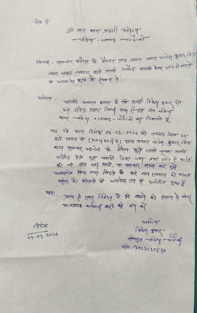 चकिया/चंदौली। जनपद चंदौली के चकिया क्षेत्र के अमरा उत्तरी गांव में कवरेज के दौरान एक पत्रकार के साथ कथित तौर पर अभद्रता और धमकी देने का मामला सामने आया है। आरोप है कि ग्राम प्रधान ने खबर कवरेज करने से नाराज होकर पत्रकार के साथ बदसलूकी की, जातिसूचक शब्दों का प्रयोग किया और मोबाइल छीनने के साथ जान से मारने की धमकी भी दी।