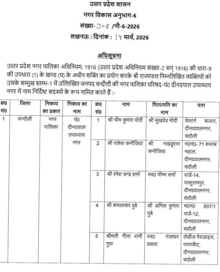 मुग़लसराय(चन्दौली)- नगर पालिका परिषद पंडित दीनदयाल उपाध्याय नगर में पांच नामित सदस्यों के नाम लिस्ट में आते ही उनके शुभचिंतको में खुशी की लहर दौड़ गयी। नामित सदस्यों में भीम मोदी,राकेश कनौजिया, रमेश शर्मा,कमलाकर दुबे व गीता रानी गुप्ता के नाम शामिल हैं।