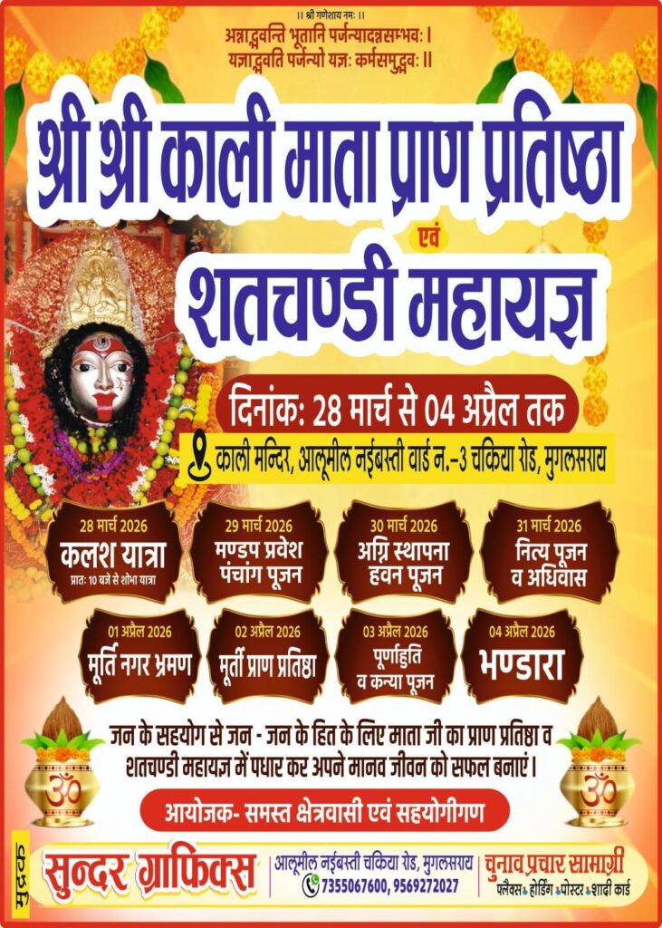मुगलसराय (पंडित दीनदयाल उपाध्याय नगर) के आलूमील नई बस्ती, चकिया रोड स्थित काली मंदिर में 28 मार्च से 4 अप्रैल 2026 तक श्री श्री काली माता प्राण प्रतिष्ठा एवं शतचण्डी महायज्ञ का आयोजन किया जाएगा।